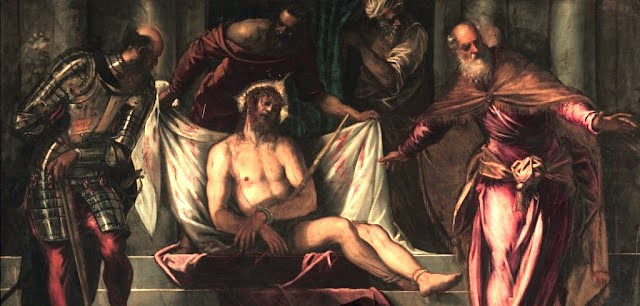 This rather unusual image of the scene suggests that Jesus was so exhausted from the scourging he had received that he was unable to stand. Alternatively, one might say that Pilate is hoping to gain the sympathy of the crowd by presenting Jesus in this way. It seems open to interpretation.