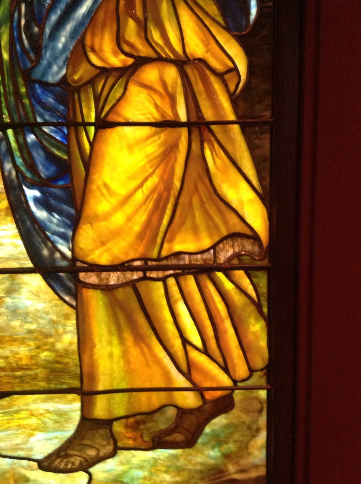 The full scale window, called The Righteous Shall Receive a Crown of Glory (also known as the Brainard Memorial Window), was done for the Methodist Church of Waterville, NY. It is the largest window in the show and a glorious example of the full scale Tiffany figural window and is attributed to Tiffany designer, Frederick Wilson.